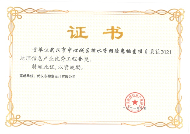 公司實(shí)施的“武漢市中心城區(qū)排水管網(wǎng)隱患排查項(xiàng)目”及“青山區(qū)北湖流域本底調(diào)查項(xiàng)目”憑借著先進(jìn)的技術(shù)手段、優(yōu)良的數(shù)據(jù)成果及多項(xiàng)專利發(fā)明獲得了“2021年地理信息產(chǎn)業(yè)優(yōu)秀工程金獎(jiǎng)”。