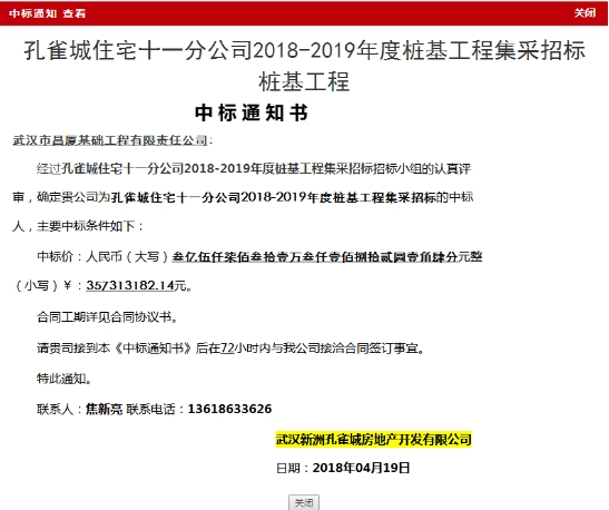 2018年4月19日,我司經(jīng)過多輪競爭報價,成功中標孔雀城住宅十一分公司2018-2019年度樁基工程集采招標樁基工程,中標價為3.57億元。 與武漢新洲孔雀城房地產(chǎn)開發(fā)有限公司合作,是我公司繼保利地產(chǎn)(集團)股份有限公司、萬科房地產(chǎn)(集團)股份有限公司、金地...